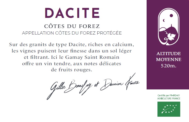Sol 100 % argilo-granitique de type GRANO-DIORITE A DACITE . Ce granit, unique dans notre région, est issu d’un bloc de roche des Monts du Forez, qui culminaient à l’ère primaire à plus de 8 000 mètres. Phénomène rare, cette DACITE contient du calcium. Cette roche s’érode en donnant des sols peu fertiles, grenus, avec des teneurs en argile faible pour la région ( environ 25 % ).